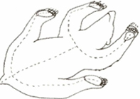 The Flat Incision - is used in rug mounts and other variety poses. The area to be cut is shown in Figure#1. Make these slits (cutting the feet free from the carcass) .The head detached as with the shoulder mount.
